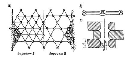 Рис. 10. Сквозное селезащитное сооружение сквозного типа из стержневых элементов: а - общий вид в плане; б - стержневой элемент; в - узел соединения элементов К достоинствам таких сооружений относятся простота формы, что удобно для массового изготовления в заводских условиях; минимум типовых размеров, удобство монтажа и транспортирования, что имеет существенное значение в труднодоступных горных районах. Недостаток сооружения заключается в том, что в такой структуре наблюдается неравномерное загружение внутренних поперечных горизонтальных балок, и это приводит к перерасходу материалов. Треугольные ячейки, отдаленные от места удара селевой массы, практически не работают. Кроме того, наличие ступеней в поперечном разрезе значительно увеличивает вероятность разрушения элементов при падении крупных валунов в режиме перелива через гребень селеуловителя. Ряд конструкций наклонных и наклонноступенчатых сквозных селеуловителей, представляющих собой решетки из железобетонных элементов, разработаны в ГрузНИИГиМ [7] и ЗакНИГМИ [11]. Сооружения этих конструкций могут достигать высоты 30 - 50 м (рис. 11).