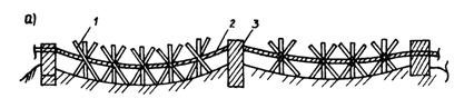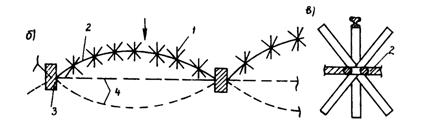 Рис. 26. Сооружение типа "противотанковые ежи"; а - общий вид; б - план; в - несущий элемент; 1 - ежи; 2 - трос; 3 - опора; 4 - различные положения сооружения Удар селевого потока противотанковые ежи принимают на себя, так как установлены в плане вогнуто в сторону верхнего бьефа. При превышении силы удара селевого потока удерживающих сил противотанковые ежи сооружения совершают сложное движение совместно с селевым потоком и принимают положение, противоположное первоначальному. Различные положения ежей зависят от мощности селевого потока. Дискретное расположение противотанковых ежей, допускающих перемещение и свободное соединение отдельных ежей канатами, интенсивно рассеивает и поглощает энергию селевых потоков и уменьшает ударные нагрузки на конструкции. Для повторного использования ежей необходимо их извлечь из-под селевых отложений краном. Применение конструкции сетчатого и решетчатого типов на склонах гор вдоль дороги является вполне целесообразным, так как в качестве материалов используются бывшие в употреблении канаты и рельсы и их монтаж на месте производства работ нетрудоемок и непродолжителен. Селеулавливающая решетка (а.с. № 1341320) состоит из стоек, расположенных рядами на склоне гор вдоль дороги и шарнирно прикрепленных к фундаменту, и из горизонтально расположенных тросов, соединенных со стойками и подпорной стенкой. Решетка также снабжена удерживающими тросами, находящимися с обеих сторон стоек и прикрепленными к ним и к фундаментным опорам на дне русла (рис. 27). Соединение удерживающих тросов с фундаментными опорами представляет собой пучки. При прохождении селевого потока по руслу частично задерживаются влекомые им грязекаменная масса, а также другие твердые предметы (деревья, кустарник и т.п.). Гашение энергии потока происходит вследствие последовательного расчленения его на отдельные струи и соударения этих струй между собой. Эффективность гашения энергии селевого потока обеспечивается автономностью шарнирного крепления стоек к фундаменту, креплением удерживающих тросов к нескольким фундаментным опорам. Масса селевого потока осаждается с верховой и низовой сторон стоек в виде плотины из грунта с верховым откосом переменной крутизны и низовым откосом, наклоненным под углом естественного откоса. Такая селеулавливающая решетка может быть устроена и на участках большой протяженности. Например, для защиты участков железных или автомобильных дорог от снежных лавин.