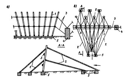 Рис. 27. Сооружение решетчатого типа с наклонными тросами: а - общий вид: б - план; 1 - стойки; 2 - удерживающий трос; 3 - трос, скрепляющий стойки; 4 - промежуточная подпорная стенка; 5 - фундаменты на дне русла Если склоны гор вдоль дороги сложены из глинистых и суглинистых грунтов, обладающих подвижными свойствами при увлажнении, то на таких участках необходимо защитить дороги не только от селевых потоков, но и устранить возможные оползневые процессы. В таких сложных природных условиях применение свайных наносоуловителей является более экономичным и надежным. Сооружение (а.с. по заявке № 4360269) состоит из отдельно размещенных комбинированных стоек, образованных из упругого материала - автомобильных покрышек, насаженных на сваи. Покрышки прикреплены к стойке со стороны дороги гибкими связями. Стойки сооружения ставятся вдоль дороги как минимум в два ряда в шахматном порядке и в том же порядке связываются между собой (через сваи) наклонными тросами (рис. 28). Тросы соединяют низ коротких стоек переднего ряда с верхом высоких стоек второго ряда со стороны дороги и так далее, образуя в плане зигзагообразную линию.