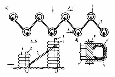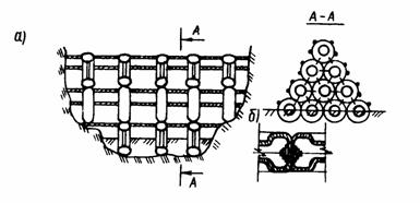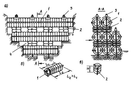Рис. 30. Сооружение арочного типа из автомобильных покрышек: а - общий вид; б, в - упругие блоки первого и второго типов; 1 - горизонтальные блоки; 2 - вертикальные блоки; 3 - гибкие связи; 4 - сквозные каналы При очистке емкости сооружения от селевых отложений достаточно отсоединить натяжное устройство от вертикальных тросов. При этом сооружения распадаются на отдельные блоки. Мелкие наносы промываются паводковой водой или гидрометом, а крупные камни удаляются механизированным способом, а затем сооружение восстанавливается для повторного использования. Треугольное поперечное селезащитное сооружение выполнено из покрышек (а.с. № 1595988), вертикально расположенных рядами вдоль селеносного русла и связанных между собой поперек русла несколькими тросами со стороны нижнего и верхнего бьефов, закрепленными концами на берегу русла. Нижние покрышки частично заделываются в грунт на дне русла (рис. 31).