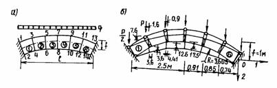 k - матрица жесткости в общей системе осей координат. Система разрешающих уравнений (13) отражает условие равновесия узлов, совокупности элементов, и порядок уравнения зависит от их числа. Для формирования матрицы К необходимо построить матрицы жесткости отдельных элементов, в случае прямоугольной формы, плоского напряженного состояния и изотропного материала это не вызывает особых затруднений [11]. По найденным из уравнения (13) узловым перемещениям определяются напряжения в области конечного элемента, которые характеризуют работу блока по длине l. Для выявления напряженно-деформированного состояния по толщине h блока необходимо перейти к изучению всего сооружения в целом. Компонуя матрицу жесткости всего сооружения и решая уравнение (13), получим вектор перемещений узлов серединной поверхности, по которому определяется напряженное состояние блока в рассматриваемой плоскости. Такой прием позволяет определить перемещения и напряжения в блоках сооружения, используя готовые матрицы жесткости. Предлагаемую методику расчета можно рассмотреть на примере. Определим перемещения и напряжения в арке кругового очертания с нагрузкой и размерами, показанными на рис. 32, а, б [17].