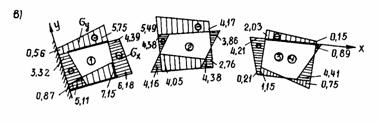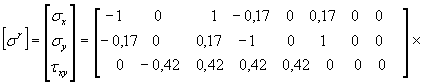 где х, у - координаты точек в области конечного элемента; μ - коэффициент Пуассона; Е - модуль упругости. Например, для первого элемента точки 3 при х = 1, у = 0, μ = 0,17 (рис. 32, б) напряжения определяются в такой последовательности: