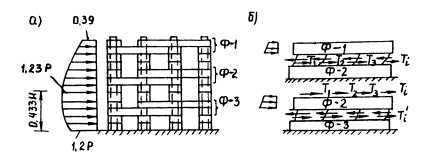 В этой формуле не учтено сопротивление трению по горизонтальным поверхностям соприкосновения стержней. Описанный расчет по формуле (24) является приближенным, так как в нем не учитывается упругая работа самого сооружения, и усилия среза во всех железобетонных столбах принимаются одинаковыми. Ввиду упругой работы сооружения при ударе селевого потока усилия среза в железобетонных столбах будут разными. Причем максимальные усилия среза будут в столбах, наиболее близких к ударной волне, минимальные - к нижнему бьефу. Уточненный расчет железобетонных столбов на срез возможен лишь при анализе упругой работы сооружения. Приближенный расчет усилий в стержнях сооружения основан на рассмотрении напряженного состояния ряда условно-плоских горизонтальных ферм, составленных из стержней, находящихся в разных слоях сооружения. Сооружения расчленяются горизонтальными поверхностями на несколько таких частей, каждая из которых может представлять ферму в проекции на горизонтальную плоскость. На рис. 33, а, показаны три таких фермы Ф-1., Ф-2, Ф-3, они соединены между собой упругими связями на сдвиг, которые имеют в каждом узле усредненную жесткость, зависящую от того, сколько стержней и на каких уровнях соединены в этом узле. Порядок расчета следующий. В начале рассчитывается самая верхняя ферма Ф-1 на ту часть нагрузки от селевого потока, которую она непосредственно воспринимает. При этом нижележащая ферма Ф-2 считается условно-неподвижной и абсолютно жестко. В расчете определяются усилия в стержнях фермы Ф-1, а также усилия в упругих связях (T1, T2, T3). В каждом узле фермы будут возникать два усилия в горизонтальной плоскости. Затем проводится аналогичный расчет фермы Ф-2 на часть нагрузки от селевого потока и усилия T1, T2, T3, передаваемые от фермы Ф-1. При этом ферма Ф-3 считается условно-неподвижной и абсолютно жесткой. Аналогично проводится расчет фермы Ф-3.