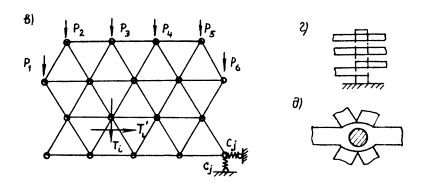 Рис. 33. Расчетная схема сооружения стержневого типа: а - поперечный разрез - разбивка на фермы; б - разбивка на составные фермы; в - план расчетной схемы; г - опорный узел; д - то же, в плане Расчетная схема каждой из ферм показана на рис. 33, б. Каждый узел фермы прикреплен к основанию двумя упругими связями одинаковой жесткости, как это показано только для нижнего правого узла. Ферма является внутренне и внешне статически неопределимой. На ферму действует часть нагрузки от лобового удара селевого потока, которая распределяется на передние узлы (сила Р1, Р2, Р3, Р4, Р5, Р6) и на пары усилий Тi. T'i в каждом узле фермы, передаваемые от вышележащей фермы. Таким образом, в расчетной схеме сооружения приняты следующие допущения: пренебрегают условиями совместной деформации между отдельными фермами; пренебрегают тем, что сходящиеся в одном узле стержни находятся на разных уровнях, жесткость упругих связей принимают средней по всем сходящимся стержням; пренебрегают тем, что пара лобовых сходящихся в узле стержней соединена между собой упругими связями. Определение жесткости упругих связей узлов фермы рассмотрим на примере узла по рис. 33,г. В узле сходятся концы шести стержней, из них два - двухпролетные цельные элементы, имеются еще три шайбы. Жесткость на сдвиг любого элемента относительно условного основания (узла нижерасположенной фермы) определяется как для систем с последовательным расположением связей