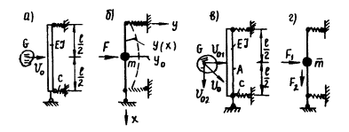 Рис. 35. Расчетные схемы балки на упругих опорах: а - схема упругоопертой балки на поперечный удар; б - динамическая расчетная схема; в - схема упругоопертой балки на косой удар; г - соответствующая расчетная схема