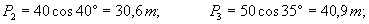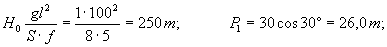 Пример. Рассмотрим один пролет l = 100 м сооружения с тремя "ежами", несущим тросом, прикрепленным к подпорным стенам. Действуют равномерно распределенная селевая нагрузка q0 =1 т/м и равнодействующие силы V1 =30 т, V2 = 40 т, V3 = 50 т, которые приложены в местах установки "ежей" и имеют разный угол отклонения в плане от оси русла d1 =30°, d2 = 40°, d3 = 35°. Влиянием трения элементов "ежей" о селевые отложения и трос в местах соединения пренебрегаем. Жесткость троса ЕF = 50000 т; максимальное отклонение троса от оси подпорных стенок f = 5 м. Определим сначала натяжение нити H0 от нагрузки g0 и вертикальных составляющих Рi от равнодействующих Тi (i = 1, 2, 3)