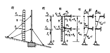 где т = Q/g - масса нагрузки на трос; ω - частота собственных колебаний троса. 5.5. Расчет решетчатого селеуловителя с наклонными тросамиОбщая схема селеуловителя представлена на рис. 37, а и состоит из стоек, шарнирно-соединенных с фундаментом, и пучкообразных поддерживающих наклонных тросов. Основная система (рис. 37, б) выбирается в виде цепи стержней на промежуточных упругих опорах с одной нижней шарнирно-неподвижной опорой. Натяжения тросов 1-5, 2-5 дают как вертикальные (V1, V2), так и горизонтальные составляющие усилия (S1, S2), передающиеся на стойку и вызывающие ее сжатие. В узлах 1, 2, 3 действуют сосредоточенные силы от удара отдельных камней потока. Кроме того, на стойку по высоте действует равномерно распределенная нагрузка от общего давления селевого потока. Полные осевые силы в стойках (рис. 37, в) S01 = S1 + S2; S12 = S2 В уравнения трех моментов для сжато-изогнутых стоек [20] войдут выражения для углов наклона изогнутой оси на опоре простой балки с учетом влияния сжимающих сил. Например, для угла поворота α10 будем иметь