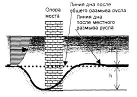 Рис. 2.1. Схема местного размыва русла у опоры эксплуатируемого моста Кv - переходный коэффициент от скорости воды перед опорой к максимальной у опоры, определяется по формуле