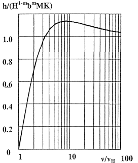 определяется путем линейной интерполяции относительная глубина, при VNH =2,27, равная h/(H1-m·bm·MK) = 0,80. Поскольку h/(60,4·30,6·1) = h/4,00, то h = 4,00×0,80 = Ответ h = Пример 4. Определить, на какую