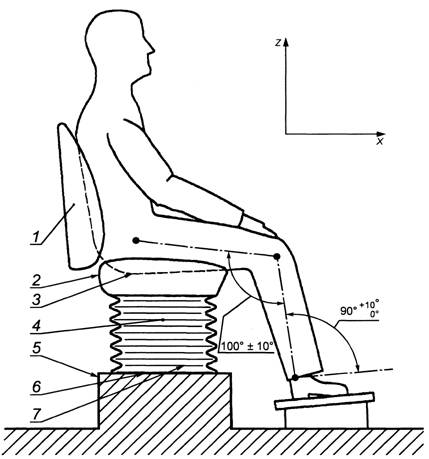 H(fr) - значение передаточной функции на резонансе; СПМ - спектральная плотность мощности; с.к.з. - среднеквадратичное значение; SEAT - коэффициент передачи сиденья; Ts - период выборки. 1 - спинка сиденья; 2 - подушка сиденья; 3 - диск с закрепленным акселерометром на подушке сиденья (S); 4 - подвеска сиденья; 5 - платформа; 6 - акселерометр, установленный на поверхности платформы (Р); 7 - опора сиденья Рисунок 1 - Положение испытателя 4 Общие положения4.1 Заданное воздействие вибрации в вертикальном направлении, воспроизводимое лабораторным вибростендом и определяемое через спектральный класс вибрационного воздействия, сформировано в результате анализа данных, полученных в жестких, но типичных рабочих условиях применения землеройных машин. Спектр вибрационного воздействия представляет собой огибающую СПМ ускорения, полученных в наихудших (с точки зрения вибрации) условиях эксплуатации машин данного класса. 4.2 Для оценки качества сиденья используют два критерия: - коэффициент передачи сиденья SEAT в соответствии с ГОСТ ИСО 10326-1 (но с применением функции частотной коррекции по ГОСТ 31191.1); - максимальный коэффициент передачи, полученный в результате испытания для определения характеристик демпфирования по ГОСТ ИСО 10326-1. 4.3 Средства измерений должны соответствовать ГОСТ ИСО 8041 и ГОСТ ИСО 10326-1. Функция частотной коррекции должна включать в себя передаточную функцию полосового фильтра и соответствовать ГОСТ 31191.1. 4.4 Меры безопасности при испытаниях - по ГОСТ 31194.1. В процессе испытаний должны быть использованы упругие упоры или другие устройства, применяемые в серийных модификациях испытуемого сиденья с целью ограничить ход подвески. 5 Условия и метод испытаний5.1 Общие положения Общие требования к проведению испытаний - по ГОСТ ИСО 10326-1. На вибростенде, способном воспроизводить вибрацию в вертикальном направлении, устанавливают платформу, размеры которой близки к размерам платформы, служащей опорой сиденью оператора в машине (см. рисунок 1). При необходимости возбуждения вибрации, соответствующей классам ЕМ 1