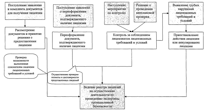 I. Общие положения1. Административный регламент Федеральной службы по экологическому, технологическому и атомному надзору по исполнению государственной функции по лицензированию деятельности по проведению экспертизы промышленной безопасности (далее - Регламент), определяет сроки и последовательность действий (административных процедур) при исполнении государственной функции - лицензирование деятельности по экспертизе промышленной безопасности проектной документации на расширение, техническое перевооружение, консервацию и ликвидацию опасного производственного объекта; технических устройств, применяемых на опасном производственном объекте; зданий и сооружений на опасном производственном объекте; декларации промышленной безопасности, разрабатываемой в составе проектной документации на расширение, техническое перевооружение, консервацию и ликвидацию опасного производственного объекта, и иных документов, связанных с эксплуатацией опасного производственного объекта (далее - деятельность по экспертизе промышленной безопасности). 2. Исполнение государственной функции по лицензированию деятельности по экспертизе промышленной безопасности осуществляется в соответствии с: Федеральным законом от 08 августа 2001 г. N 128-ФЗ "О лицензировании отдельных видов деятельности" (Собрание законодательства Российской Федерации, 2001, N 33, ст. 3430); Федеральным законом от 08 августа 2001 г. N 134-ФЗ "О защите прав юридических лиц и индивидуальных предпринимателей при проведении государственного контроля (надзора)" (Собрание законодательства Российской Федерации, 2001, N 33, ст. 3436); Федеральным законом от 21 июля 1997 г. N 116-ФЗ "О промышленной безопасности опасных производственных объектов" (Собрание законодательства Российской Федерации, 1997, N 30, ст. 3588); Кодексом Российской Федерации об административных правонарушениях от 30 декабря 2001 г. N 195-ФЗ (Собрание законодательства Российской Федерации, 2002, N 1, ст. 1); Налоговым кодексом Российской Федерации (Собрание законодательства Российской Федерации, 1998, N 31, ст. 3824; 2000, N 32, ст. 3340); Постановлением Правительства Российской Федерации от 26 января 2006 г. N 45 "Об организации лицензирования отдельных видов деятельности" (Собрание законодательства Российской Федерации, 2006, N 6, ст. 700); Постановлением Правительства Российской Федерации от 22 июня 2006 г. N 389 "О лицензировании деятельности по проведению экспертизы промышленной безопасности" (Собрание законодательства Российской Федерации, 2006, N 26, ст. 2851); Постановлением Правительства Российской Федерации от 11 апреля 2006 г. N 208 "Об утверждении формы документа, подтверждающего наличие лицензии" (Собрание законодательства Российской Федерации, 2006, N 6, ст. 700); Постановлением Правительства Российской Федерации от 30 июля 2004 г. N 401 "О Федеральной службе по экологическому, технологическому и атомному надзору" (в ред. Постановлений Правительства Российской Федерации от 21 января 2006 N 23, от 29 мая 2006 N 335, от 14 декабря 2006 N 767); Общими правилами промышленной безопасности для организаций, осуществляющих деятельность в области промышленной безопасности опасных производственных объектов, утвержденными постановлением Госгортехнадзора России от 18 октября 2002 г. N 61-А (зарегистрировано в Минюсте России 28 ноября 2002 г. N 3968); Правилами проведения экспертизы промышленной безопасности (в редакции