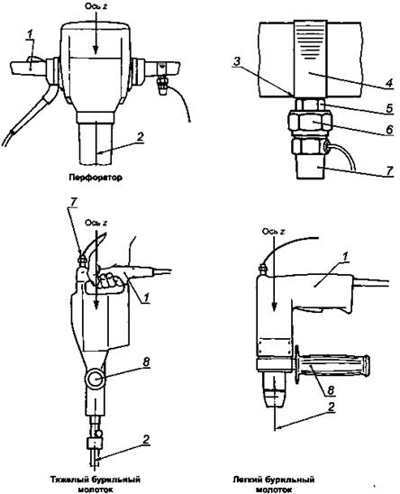 1 - основная рукоятка; 2 - ось бурового наконечника; 3 - отфрезерованная поверхность; 4 - хомут; 5 - приварная гайка; 6 - механический фильтр; 7 - датчик вибрации (на рукоятку легкого/тяжелого бурильного молотка может быть приклеен непосредственно или через переходный элемент); 8 - боковая рукоятка Рисунок 1 - Способы крепления датчика вибрации и направление измерений 5.5. Калибровка Калибровку выполняют в соответствии с ГОСТ 16519. 6. Точки и направления измеренийИзмерения проводят в направлении возвратно-поступательного движения вставного инструмента (ось z1) на рисунке 1). Примечание - При оценке воздействия вибрации на оператора ручной машины на рабочем месте измерения проводят по всем трем направлениям, определенным в приложении А (см. ГОСТ 31192.2). 6.2. Точки измерений Измерения проводят на основной рукоятке, за которую оператор удерживает машину при ее нормальной работе и к которой прикладывает силу нажатия. Нормальное положение датчика - посередине рукоятки (см. рисунок 1). В машинах с рукоятками лучкового (открытых или закрытых) или пистолетного типа такому размещению датчика может помешать положение пускового устройства. В этом случае датчик вибрации устанавливают как можно ближе к ладони оператора между большим и указательным пальцами. Для машин с двумя рукоятками датчик вибрации устанавливают на той рукоятке, где нет пускового устройства. 1) Направления измерений в системе координат, связанной с машиной, определены в приложении А. 7. Условия испытаний7.1. Общие положения Для испытаний используют новую смазанную машину, обеспеченную соответствующим техническим уходом. Ручные машины с электрическим или гидравлическим приводом, а также с приводом от двигателя внутреннего сгорания перед проведением измерений необходимо прогревать в течение 10 мин. Пневматические машины такого прогрева не требуют. В процессе испытания ручная машина должна работать при номинальных условиях питания в соответствии с требованиями, определенными изготовителем. Работа ручной машины должна быть стабильной и плавной (см. 7.3). Рабочие характеристики ручной машины, например скорость вращения, должны быть отрегулированы в соответствии с используемым буровым наконечником согласно рекомендациям изготовителя. В процессе испытаний буровой наконечник должен вращаться. В процессе испытаний объект обработки или поглотитель энергии ударов устанавливают таким образом, чтобы оператор мог работать выпрямившись, а ось нанесения ударов была расположена вертикально (см. рисунки 2 и 3).