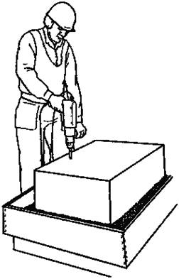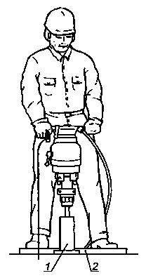 Рисунок 2 - Рабочая поза оператора, проводящего испытания бурильного молотка 1 - поглотитель энергии; 2 - весы Рисунок 3 - Рабочая поза оператора, проводящего испытания перфоратора 7.2. Нагрузка 7.2.1. Нагрузка для испытаний бурильных молотков и легких перфораторов Во время испытаний оператор пробивает отверстие в прямоугольном блоке из шлакового цемента