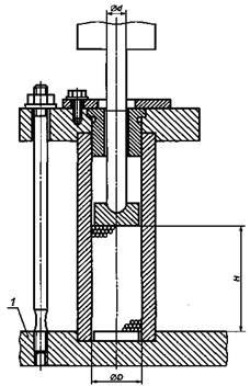 D равен 7.3. Сила нажатия Сила нажатия, приложенная к машине, в совокупности с весом самой машины должна обеспечить ее нормальное функционирование, т.е. стабильность работы и отсутствие контактов с буртиком вставного инструмента. Обычно такие условия достигаются приложением силы нажатия FA в ньютонах, численно равной увеличенной в 15 раз массе машины, выраженной в килограммах. Сила нажатия должна находиться в диапазоне от 80 до 200 Н. Пример - Для машины массой Для контроля и управления силой нажатия FA оператор в процессе испытаний встает на весы. Тогда сила нажатия будет равна весу оператора за вычетом показания весов. 1 - бетонный блок Рисунок 4 - Поглотитель энергии со стальными шариками 7.4. Вставной инструмент При испытаниях бурильных молотков применяют только те буровые наконечники, которые рекомендованы изготовителем. Рабочую длину штанги и диаметр бурового наконечника выбирают по таблице 1. Таблица 1 - Размеры бурового наконечника В миллиметрах