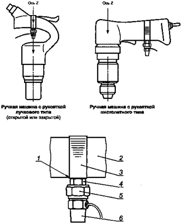 1 - отфрезерованная поверхность; 2 - рукоятка; 3 - хомут; 4 - приварная гайка; 5- механический фильтр; 6 - датчик вибрации Рисунок 1 - Способы крепления датчика вибрации и направление измерений 6. Точки и направления измеренийИзмерения проводят в направлении возвратно-поступательного движения вставного инструмента (ось z1) на рисунке 1). Примечание - При оценке воздействия вибрации на оператора ручной машины на рабочем месте измерения проводят по всем трем направлениям, определенным в приложении А (см. ГОСТ 31192.2). 6.2. Точки измерений Измерения проводят на основной рукоятке, за которую оператор удерживает машину при ее нормальной работе и к которой прикладывает силу нажатия. Нормальное положение датчика - посередине рукоятки (см. рисунок 1). 1) Направления измерений в системе координат, связанной с машиной, определены в приложении А. 7. Условия испытаний7.1. Общие положения Для испытаний используют новую смазанную машину, обеспеченную соответствующим техническим уходом. Ручные машины с электрическим или гидравлическим приводом, а также с приводом от двигателя внутреннего сгорания перед проведением измерений необходимо прогревать в течение 10 мин. Пневматические машины такого прогрева не требуют. В процессе испытания ручная машина должна работать при номинальных условиях питания в соответствии с требованиями, определенными изготовителем. Работа ручной машины должна быть стабильной и плавной (см. 7.3). В процессе испытаний объект обработки или поглотитель энергии ударов устанавливают таким образом, чтобы оператор мог работать выпрямившись, а ось нанесения ударов была расположена вертикально (см. рисунок 2).