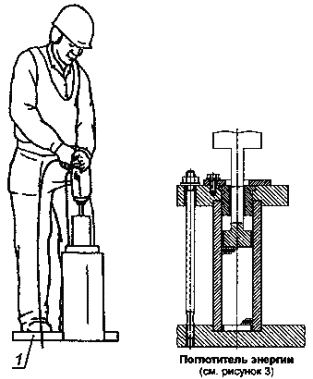 1 - весы Рисунок 2 - Рабочая поза оператора 7.2. Поглотитель энергии ударов Используемая при испытаниях нагрузка представляет собой поглотитель энергии со стальными шариками, позволяющий поглощать значительную часть ударной волны и отражать назад от 15 % до 20 % энергии удара, что характерно для использования ручной машины на рабочем месте при выполнении рабочих операций. Поглотитель энергии состоит из стальной трубы, жестко установленной на твердой плите массой