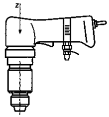 Рисунок 2 - Направления измерений и примеры размещения датчика вибрации Датчик может быть закреплен одним из следующих способов: - с использованием хомута, к которому приварен или припаян переходный блок (см. рисунок 1 А); - с использованием адаптера (фиксируемого пластиковыми лентами) с резьбовым соединением для установки датчика (см. рисунок 1 В); - приклеиванием датчика к плоской поверхности (см. рисунок 1 С); - предварительной подготовкой плоской поверхности, высверливанием отверстия и нарезанием резьбы для установки датчика (см. рисунок 1D). Дополнительные рекомендации по креплению датчиков вибрации приведены в ГОСТ 31192.2. 5.5. Калибровка Калибровку выполняют в соответствии с ГОСТ 16519. 5.6. Вспомогательное оборудование Давление подачи воздуха или жидкости измеряют прецизионным манометром. Частоту ударов ручной машины измеряют с использованием сигнала датчика вибрации посредством его анализа в узкой полосе частот или частотомером. Для измерения силы нажатия используют весы (см. 7.3). 6. Точки и направления измерений6.1. Направление измерений Измерения проводят в направлении, параллельном оси нанесения ударов - по координате z для ручных машин с рукояткой пистолетного типа и по координате х - для прямых ручных машин (см. рисунок 2). 6.2. Точки измерений Измерения проводят на основной рукоятке, за которую оператор удерживает машину при ее нормальной работе и к которой прикладывает усилие нажатия. Для машин с рукояткой пистолетного типа датчик вибрации устанавливают на рукоятке в точке посередине ее длины (см. рисунок 2b). Если такому размещению датчика мешает пусковое устройство, то датчик устанавливают как можно ближе к указанной точке. Для прямых ручных машин датчик устанавливают на жестком элементе, надежно соединенном с рукояткой ручной машины (см. рисунок 2с). 7. Условия испытаний7.1. Общие положения Для испытаний используют новую, смазанную ручную машину, обеспеченную соответствующим техническим уходом. Ручные машины с гидравлическим приводом до начала проведения измерений прогревают, давая им работать в течение приблизительно 10 мин. Пневматические машины такого прогрева не требуют. В процессе испытания ручная машина должна работать в номинальных условиях питания в соответствии с требованиями, определенными изготовителем. Работа ручной машины должна быть стабильной и плавной (см. 7.3). В процессе испытаний поглотитель энергии ударов устанавливают так, чтобы оператор мог работать выпрямившись или почти выпрямившись, а ось нанесения ударов была расположена вертикально (см. рисунок 3).