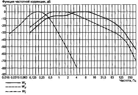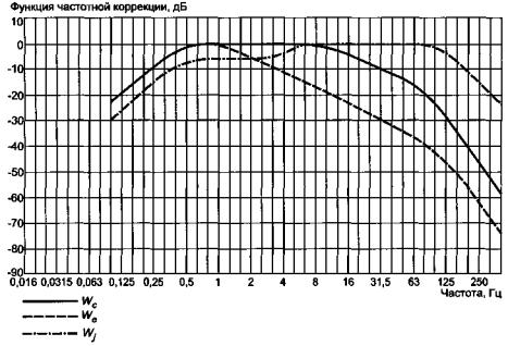 Рисунок 3 - Дополнительные функции частотной коррекции Частотная коррекция может быть аппаратно реализована как в аналоговом, так и в цифровом виде. В приложении А дано аналитическое представление функций частотной коррекции в форме фильтров. Функции частотной коррекции, приведенные в таблицах 3 и 4 и на рисунках 2 и 3, даны с учетом фильтрации сигнала полосовым фильтром. Уравнение для такого фильтра в приложении А приведено отдельно. 6.4.1.1 Фильтрация в полосе частот Высокочастотные и низкочастотные составляющие вибрации обрезаются в результате совместного использования двухполюсных фильтров Баттерворта низких и высоких частот соответственно, имеющих спад за частотой среза 12 дБ на октаву. Частоты среза полосовых фильтров отстоят на треть октавы по обе стороны от номинального диапазона частот измерений. Функции частотной коррекции Wc, Wd, We, Wj и Wk реализованы (см. приложение А) с помощью полосового фильтра, пропускающего составляющие на частотах свыше 0,4 Гц и ниже 100 Гц, a Wf - с помощью фильтра, пропускающего частоты в полосе от 0,08 до 0,63 Гц. В пределах номинальной полосы частот плюс треть октавы по обе стороны от этой полосы допуск на функцию частотной коррекции (включающей в себя полосовую фильтрацию) составляет ±1 дБ. За границами этого диапазона допуск равен ±2 дБ. На расстоянии октавы по обе стороны от номинальной полосы частот ослабление сигнала может спадать до бесконечности (см. также ГОСТ ИСО 8041). 6.4.2 Частотная коррекция ускорения в частотной области Допускается проводить измерения некорректированного виброускорения в третьоктавных или узких полосах частот. В случае анализа в третьоктавных полосах частот их среднегеометрические частоты должны соответствовать значениям, приведенным в таблицах 3 и 4. При любой форме спектрального анализа - аналоговой или цифровой - среднеквадратичное значение виброускорения в третьоктавной полосе частот может быть получено непосредственным измерением или суммированием результатов измерений в узких полосах частот. Используемые при анализе вибрации третьоктавные фильтры должны удовлетворять требованиям ГОСТ 17168-82. Среднеквадратичное значение корректированного виброускорения должно быть получено путем умножения результатов измерений в третьоктавных или узких полосах частот на соответствующие весовые коэффициенты с последующим суммированием. Весовые коэффициенты, используемые при анализе в третьоктавных полосах частот, приведены в таблицах 3 и 4. Корректированное виброускорение aw м/с2 (рад/с2), должно быть получено в результате аналоговой или цифровой реализации во временной или частотной области следующего алгоритма: