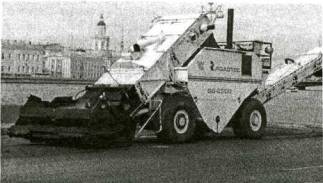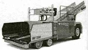 Рис. 5. Перегрузчик марки MF-250 фирмы Dynapac Опыты эксплуатации перегрузчиков фирм США, Германии и Швеции в России показали, что бесконтактная и равномерная загрузка асфальтоукладчика позволяет асфальтоукладчику двигаться не только непрерывно, но и с более высокой скоростью, так как у него отпала необходимость толкать груженые автосамосвалы или останавливаться во время их разгрузки. Практическая производительность асфальтоукладчиков заметно приблизилась к теоретической.