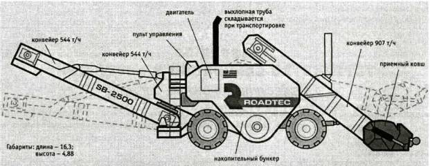 Рис.1. Машина для перегрузки асфальтобетонной смеси фирмы ROADTEC марки SB-2500 Машины для перегрузки асфальтобетонной смеси обеспечивают: - бесконтактную перегрузку асфальтобетонной смеси из бункера перегрузчика в бункер асфальтоукладчика, обеспечивая при этом непрерывность движения асфальтоукладчика в процессе устройства дорожного покрытия; - исключение удара автосамосвала на корпус асфальтоукладчика в момент касания; - исключение неизбежных неровностей покрытия, возникающих при выгрузке смеси из кузова автосамосвала непосредственно в бункер асфальтоукладчика. Однако основным назначением машин для перегрузки асфальтобетонной смеси является устранение отрицательного влияния температурных и фракционных расслоений. При температурном расслоении происходит неравномерное остывание асфальтобетонной смеси в различных участках кузова автосамосвала и бункера асфальтоукладчика. При фракционном расслоении происходит распределение смеси по высоте слоя в зависимости от крупности зерен (более крупные зерна скатываются вниз). Наблюдения за температурой смеси, выгружаемой с грузовика, показали, что верхний слой асфальта при начальной температуре в 145° после перевозки на 15-25 км остывает примерно до 100-110°. Перемешивание асфальтобетонной смеси в бункере перегрузчика перед укладкой в бункер асфальтоукладчика позволяет равномерно распределить крупные частицы щебня по всему объему смеси и выровнять ее температуру, что обеспечивает равномерную плотность дорожного покрытия. Схема конструктивного устройства машины для перегрузки асфальтобетонной смеси типа SB-2500 фирмы ROADTEC представлена на рис.2.