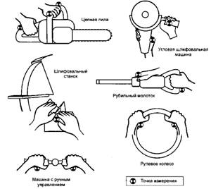 На практике часто наблюдают случаи, когда рука рабочего во время выполнения операции находится в постоянном контакте с ручной машиной или обрабатываемой деталью, но сама машина работает с короткими перерывами. Примером операции такого типа является работа с шлифовальными машинами, цепными пилами, зубильными молотками.