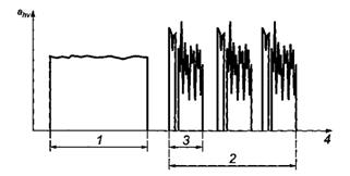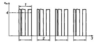 1 - длительность измерений; 2 - время выполнения операции (воздействия вибрации); 3 - время; 4 - ahv,measured