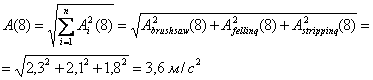 Обрезка сучьев от ствола каждого упавшего дерева занимает в среднем 4 мин, т.е. всего 2 ч для 30 деревьев. Уровень вибрации непостоянен (есть участки роста и понижения в зависимости от обрезаемой ветки), поэтому для получения представительного интервала для данной операции было проведено усреднение в течение большого интервала времени. Средний уровень вибрации для операции обрезки составил 3,6 м/с2. Долю данной операции Astrippinq(8) рассчитывают по формуле (3):