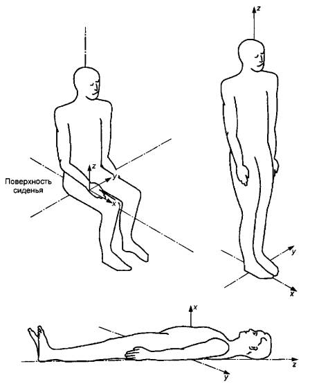 Рисунок 1 - Базицентрические оси человеческого тела 4.3 Потенциальный риск Оборудование для воспроизведения вибрации, используемое в испытаниях, способно высвобождать и аккумулировать большое количество энергии. При этом вследствие каких-либо неисправностей оборудования субъект испытаний может быть подвергнут воздействиям, которые будут для него неожиданными, пугающими и, в худшем случае, потенциально опасными. Поэтому конструкция оборудования должна быть такой, чтобы в случае его неисправности или аварийного останова субъект не подвергался воздействию вибрации слишком большого уровня (т.е. превышающей некоторые допустимые значения) или слишком большой длительности. Исключением являются случаи, когда суть испытания состоит в изучении влияния воздействия сильной вибрации. Но и при этом конструкция испытательного оборудования должна быть такова, чтобы при любых неисправностях уровень вибрации только незначительно превышал тот, который должен иметь место при нормальном ходе испытаний. Для проверки безопасности его конструкции оборудование должно быть испытано в условиях моделирования неисправностей (см. приложение Е). 4.4 Физический контакт с движущимися частями 4.4.1 Общие положения Риск физического контакта людей с различными предметами в процессе проведения испытаний имеет место в ситуациях, когда: a) исследователь или другие лица, находящиеся поблизости от испытательного оборудования, могут получить удар из-за нечаянного контакта с движущимися частями оборудования; b) субъект, совершающий перемещения вместе с подвижной платформой, может получить удар из-за нечаянного контакта с неподвижными объектами; c) кто-либо, находящийся на самом оборудовании или вблизи него, может подвергнуться риску быть зажатым между подвижными и неподвижными частями. 4.4.2 Ограничения подвижности субъекта испытаний В случае проведения испытаний, предусматривающих ограничение подвижности субъекта испытаний, особые меры должны быть приняты к тому, чтобы в процессе нормальной работы оборудования или при его неисправности наложенные связи не представляли сами по себе опасности для субъекта. 5 Классификация испытаний по жесткости воспроизводимой вибрацииНастоящий стандарт устанавливает двухуровневую классификацию испытаний в соответствии с предполагаемой степенью риска: должен или нет при проведении испытаний присутствовать врач (медицинский работник). Критерием выбора является степень жесткости воспроизводимой вибрации. План испытаний, в которых предполагается воздействие вибрации на человека, должен быть рассмотрен и утвержден законодательно установленным на национальном уровне независимым органом (см. приложение F). Независимый орган принимает решение, содержится ли в испытании риск, превышающий минимальный, и какая степень медицинского наблюдения при этом требуется. 5.2 Испытания с минимальным риском Считают, что риск при проведении испытаний минимален, если в ходе этих испытаний субъект будет подвергнут воздействию вибрации, сравнимой с вибрацией в обычных условиях на транспорте или на рабочем месте (см. приложение А). В таких случаях обычно присутствие медицинского работника во время проведения испытаний не требуется. 5.3 Испытания с повышенным риском Если в процессе испытаний субъект будет подвергнут воздейств