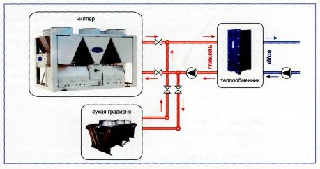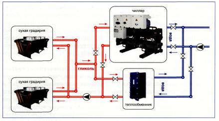 Рис. 2. Чиллер с воздушным отоплением конденсатора, теплообменник вода/гликоль и градирня в варианте с системой free-cooling (опция) Вариант 5. Чиллер с жидкостным охлаждением конденсатора + сухая градирня Этот вариант имеет в основном положительные стороны: • высокая энергетическая эффективность; • нет угрозы размораживания; • круглогодичный режим работы (до -45 °С); • низкий уровень шума снаружи (определяется подбором градирни); • уменьшение нагрузки на кровлю; • защищенность чиллера; • режим свободного охлаждения встраивается с минимальными затратами добавляется только теплообменник гликоль/вода); • нет ограничений по расстоянию между чиллером и градирней; • нет необходимости в сложном сезонном техническом обслуживании. К минусам можно отнести только удорожание системы по сравнению с первым вариантом примерно на 60 %. Вариант 6. Отличается от предыдущего тем, что применяются водоохлаждаемые чиллеры с принципиально другим типом компрессоров - центробежным Такой тип компрессоров позволяет достигать рекордной для парокомпрессионных чиллеров энергетической эффективности (СОР ~ б). Энергетическая эффективность увеличивается при снижении температуры охлаждающей жидкости. Поэтому в ХС с центробежными чиллерами, как правило, поменяются испарительные градирни, позволяющие поддерживать температуру охлаждающей воды ~30 °С. Такой вариант актуален для мегапроектов с мощностью ХС 3-20 МВт. Основные плюсы: • максимальная энергетическая эффективность для парокомпрессионных чиллеров; • низкие капитальные затраты. Минусы: • минимальная производительность чиллеров - 30 % от номинала; • требуется подпитка контура охлаждающей воды. Если нет необходимой для холодильной станции энергетической мощности или цена ее подключения высока, но есть возможность присоединения к газопроводу, то неизбежно получаем вариант 7.
