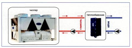 Рис. 1. Чиллер с воздушным охлаждением конденсатора (вода) Вариант 2. Система, состоящая из чиллера с воздушным охлаждением конденсатора наружной установки с незамерзающей жидкостью в качестве холодоносителя и теплообменника гликоль/вода Чиллер, как правило, работает по температурному графику 5/10 °С, а охлаждаемая вода после теплообменника имеет параметры 7/12 °С. Плюсы этого варианта по сравнению с первым: • нет необходимости сезонного опорожнения и заполнения гидравлической системы; • отсутствует угроза размораживания испарителя чиллера; • возможность работы системы при отрицательных температурах наружного воздуха; • возможность интегрирования в систему сухой градирни для реализации режима свободного охлаждения в холодный период года. Однако возникают и существенные минусы: • удорожание ХС - 30 % (без учета градирни); • повышение энергопотребления (за счет применения гликоля, более низких температур теплоносителя, добавления второго гидравлического контура); • угроза размораживания теплообменника гликоль/вода при запуске системы зимой, особенно при перерывах в эксплуатации (требуется дополнительная автоматика). Вариант 3. Воздухоохлаждаемый чиллер со встроенной градирней для реализации режима свободного охлаждения В этом случае в холодный период года автоматика чиллера сама выбирает оптимальный режим работы (компрессоры, градирня или смешанный). Таким образом достигается максимальное энергосбережение. В ряде случаев можно использовать такой тип ХС без промежуточного теплообменника гликоль/вода (например, в технологических процессах). Вариант 4. Чиллер внутренней установки с выносным конденсаторомПлюсы системы: • нет угрозы размораживания, возможность работы при отрицательных температурах (ограничения - технические характеристики чиллера:-15...-20 °С); • возможность уменьшения уровня шума снаружи; • уменьшение весовой нагрузки на кровлю; • чиллер в большей мере защищен от вандализма. Минусы системы: • свободное охлаждение возможно только как самостоятельная отдельная система; • удорожание по сравнению с вариантом 1 примерно на 40 %; • круглогодичная работа возможна только в южных регионах; • ограничение по расстоянию между чиллером и конденсатором (≤ 30 м); • большой объем фреона в системе; • необходимость высококвалифицированного монтажа. Основные характеристики холодильных систем различных типов