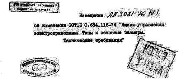 Стр. 2. Ввести пункт 1.6. "1.6. Все размеры, приведенные в чертежах на ящики управления, кроме габаритно-установочных, являются рекомендуемыми. Габаритные размеры ящиков управления могут иметь отклонения ±5 мм". Пункт 2.13 исключить. Пункт 2.15 второе предложение изложить в новой редакции: "По внешнему виду покрытие наружных поверхностей дверей должно соответствовать классу V, остальных поверхностей - классу VI по ГОСТ 9.032-74. Стр. 11. Примечание к п. 2.15 исключить.