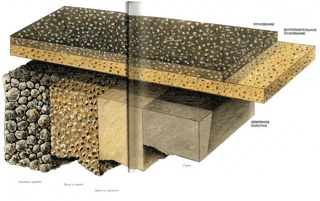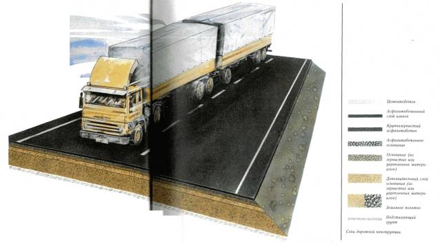 Сверху вниз: асфальтобетонный слой износа (3-7 см), слой покрытия
