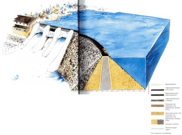 ЗЕМЛЯНЫЕ ДАМБЫ Земляная дамба состоит из различных секций. Сердцевина состоит из непроницаемого грунта с определенным процентом примесей. Тело дамбы формируется из поддерживающих боковых наполнителей, в то время как фильтрующие слои обеспечивают требуемый дренаж и перемещение воды из одной материальной зоны в другую. Земляные дамбы с непроницаемой облицовкой выше уровня воды, изготовленной из асфальта или бетона, становятся наиболее распространенными.