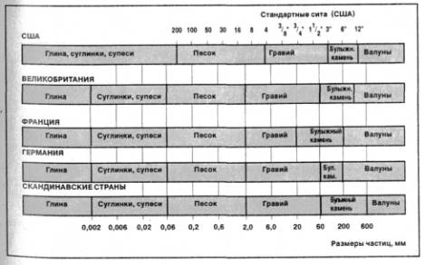 Система классификации грунтов по гранулометрическому составу в различных странах.
