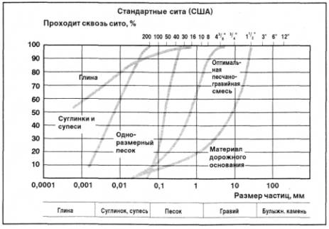 Сита используются для анализа гранулометрического состава и разделения зерен по размеру с образце грунта. Количество вещества, остающееся на каждом сите, подсчитывается в процентном отношении к общей массе образца. Результаты представлены в диаграммах как кривая гранулометрического состава. КЛАССИФИКАЦИЯ ТИПОВ ГРУНТОВ Типы минеральных грунтов в основном классифицируются по размеру зерна. Размер зерна в классификационных системах различается незначительно в разных странах. Различные типы грунтов, определяемые по размеру зерен, редко встречаются в природе в чистом виде. Обычно они находятся в смеси двух или трех типов: например, песчаный гравий, пылеватый песок, пылеватая глина и т.д. Определение разброса по величине зерна в материале является основой для установления типа грунта. Классификация связных грунтов помимо прочего включает также два типа испытаний на консистенцию: одно для определения предельно допустимой влажности, другое - пластичности. К одной из наиболее распространенных классификаций грунтов относится унифицированная система классификации грунтов USCS), которая различает 15 групп грунтов, определяемых но названию и буквенному символу. В дорожном строительстве широко применима иная система, известная как классификация ААSНО. Грунты могут также быть подразделены на иные группы, например, такие как дренирующие и педренирующие, крупнозернистые и мелкозернистые, дробленые и педробленые, несвязные, полусвязные и связные. Дренирующие грунты содержат максимум от 5 до 10 % примесей (пыль, глина). Нет общих правил, которые бы регулировали допустимый максимум содержания примесей в крупнозернистых и дробленых типах грунтов. Он колеблется от 15 до 20 % в зависимости от используемой системы классификации.