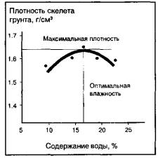Результаты испытаний различных типов грунтов по модифицированному Проктору. ИСПЫТАНИЕ ПО ПРОКТОРУ ПРОВОДИТСЯ С РАЗНЫМИ ВЛАЖНОСТЯМИ ОБРАЗЦА ГРУНТА. ПОЛУЧЕННЫЕ ПЛОТНОСТИ НАНЕСЕНЫ НА ГРАФИК (СМОТРИ ВЫШЕ). СОДЕРЖАНИЕ ВЛАГИ, ПРИ КОТОРОМ ДОСТИГАЕТСЯ НАИБОЛЬШАЯ ПЛОТНОСТЬ, ПРИНИМАЕТСЯ ЗА ОПТИМАЛЬНУЮ ВЛАЖНОСТЬ.