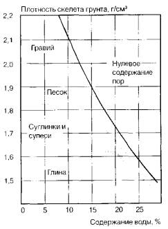 Кривые гранулометрического состава материала показывают диапазон разброса размеров частиц для различных типов грунтов. Во Франции и США соответствующие кривые показывают крупные частицы в левой части, а мелкие - в правой части. ВЛИЯНИЕ ВЛАЖНОСТИБольшинство грунтов достигает своей наибольшей плотности при определенном оптимальном содержании влаги для данного уплотняющего усилия. Другими словами, сухой грунт является достаточно крепким и сопротивляется уплотнению, в то время как влажный грунт мягок и его легче уплотнить. Однако, чем выше содержание влаги, тем ниже плотность материала. Наибольшая плотность достигается при оптимальном содержании влаги, являющимся промежуточным между полностью влажным и сухим его состоянием. Стандартным методом для ее определения служит испытание по Проктору. Чистый песок и гравий, так же как другие дренирующие зернистые материалы, менее чувствительны к вариациям содержания влаги и могут достигать максимальной плотности в абсолютно сухом или водонасыщенном состоянии. Низкая плотность при влажности между сухим и водонасыщенным состоянием является результатом кажущейся связности (смотри рисунок ниже).