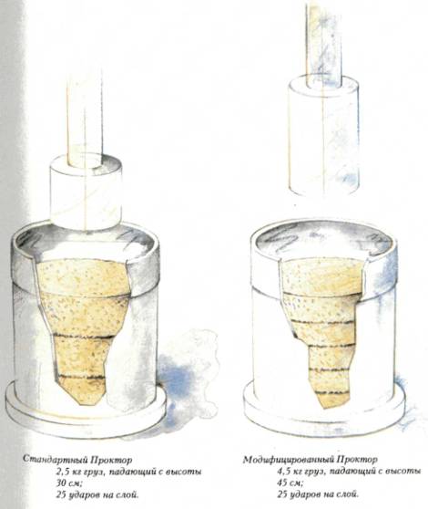 Кажущаяся связность возникает как результат капиллярных сил, которые порождены водой в частично заполненных пустотах, удерживающих частицы посредством упругих связей. Чем меньше размер частиц, тем выше кажущаяся связность. Испытание по Проктору - стандартный лабораторный метод для определения соотношения между плотностью и влажностью. Образец грунта, который необходимо испытать, помещается в цилиндрическую ферму (обычно десятисантиметрового диаметра) и уплотняется с помощью падающего груза. В стандартном приборе Проктора используется трамбовка массой 2,5 кг для уплотнения трех слоев грунта. Испытание определяет оптимальное содержание влаги грунта, равно как и максимальную плотность. Эти показатели в дальнейшем используются как эталонная плотность для полевых испытаний. Плотность выражается в виде сухой плотности, которая является отношением между массой грунтовых частиц и объемом образца грунта. Когда предъявляются более высокие требования к уплотнению, используется модифицированный прибор Проктора. Трамбовка массой 4,5 кг уплотняет пять слоев грунта, при этом энергия уплотнения образца в 4,6 раза повышается по сравнению со стандартным Проктором. Это повышает эталонную плотность на 5 % для крупнозернистых грунтов и на 10 % и более - для мелкозернистых грунтов. С увеличением транспортных нагрузок на дороги модифицированный Проктор становится более предпочтительным в технических дорожных требованиях.