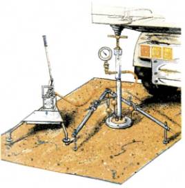 Буровая установка для отбора кернов. Радиометрические приборы для определения плотности могут быть использованы для быстрого определения плотности на строительной площадке. Как упоминалось выше, они очень практичны при определении режимов укатки в начале работы. Сейчас эти приборы дорабатываются для достижения точных показаний плотности на тонких слоях асфальтобетона. Также вводятся в практику радиометрические приборы для измерения плотности, установленные на катках. Окончательная оценка уровня плотности, однако, основана на лабораторных испытаниях выбуренных кернов.