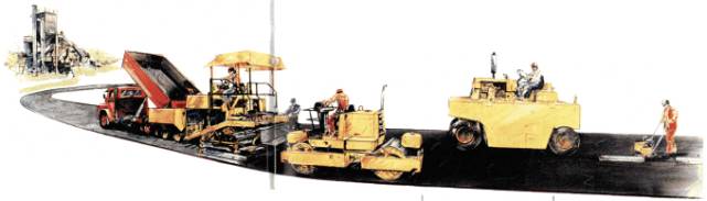 Асфальтобетонная смесь содержит строго определенное количество каменного материала, минерального порошка и битума, а также включает в себя поры, содержащие воздух. Полный процесс устройства асфальтобетонного слоя можно представить в виде цепи, звеньями которой являются: изготовление смеси, транспортировка, подгрунтовка, укладка и уплотнение. Высокая производительность, однородное качество и экономичность строительства зависит от точного объединения в одно целое этих составных частей. ПРИГОТОВЛЕНИЕ АСФАЛЬТОБЕТОННЫХ СМЕСЕЙ Асфальтобетонная смесь производится одним из двух способов: на заводах циклического действия или на заводах непрерывного действия (сегодня это обычно заводы барабанного типа). Заводы циклического действия состоят из бункеров для материалов, барабана для сушки каменного материала и агрегата смешения, большинство из них производят 50-150 тонн асфальтобетонной смеси в час. Заводы барабанного типа имеют большую производительность, чем заводы циклического действия. Они отличаются тем, что каменный материал сушится и смешивается с битумом во вращающемся барабане. В обоих типах заводов, чтобы добиться их лучшего использования, применяются теплоизоляционные термос-бункеры. Модифицированные варианты заводов циклического действия и барабанного типа используются для реновации асфальтобетона. ТРАНСПОРТИРОВКА Смесь загружается в грузовики для транспортировки к асфальтоукладчику. В идеале должен быть постоянный поток грузовиков к месту производства работ, чтобы обеспечить непрерывную работу асфальтоукладчика. Транспортировка от завода до асфальтоукладчика требует точной синхронизации, и поэтому следует принимать во внимание такие факторы, как расстояние до места производства работ, условия движения и т.д. ПОДГРУНТОВКА Перед укладкой по поверхности нижележащего слоя распределяется подгрунтовка (битумная эмульсия или праймер) для того, чтобы связать два слоя. При больших объемах работ используются специальные распределители битума с распределительными балками (автогудронаторы), а при малых объемах распределение производится вручную. УКЛАДКА Назначение асфальтоукладчика - распределить и предварительно уплотнить асфальтобетонную смесь. Современные асфальтоукладчики работают с высокой производительностью и точностью и могут укладывать широкий спектр смесей. Ширина укладки обычно колеблется от 2,5 до 8,5 м и более. Системы предварительного распределения материала обеспечивают однородное распределение и прямые кромки. Для точного управления укладкой используют автоматические системы задания уровня, которые облегчают контроль продольного и поперечного уклонов. УПЛОТНЕНИЕ Для уплотнения асфальтобетона и обеспечения отделки поверхности используют катки. Катки бывают статические гладковальцовые, на пневматических шинах, а так же вибрационные. Часто различные типы катков работают в комбинации друг с другом. Выбор катков также, как и современные режимы уплотнения играют важную роль в получении точно определенных результатов. В стесненных условиях очень полезным дополнением к тяжелому оборудованию, уплотняющему асфальтобетон, являются виброплиты.