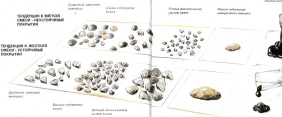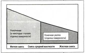 Мягкие смеси часто содержат природный (окатанный) каменный материал с небольшим количеством минерального порошка и битум низкой вязкости. Они более пластичны и требуют осторожного уплотнения, чтобы избежать горизонтального сдвига и образования трещин на поверхности. Покрытия из таких смесей несдвигоустой-чивы и менее прочны. Жесткие смеси - это смеси с использованием дробленого каменного материала, содержащего большое количество крупного материала и достаточным количеством минерального порошка, смешанного с вязким битумом. Они оказывают сильное сопротивление уплотнению и требуют большего уплотняющего воздействия, чтобы достичь установленной плотности. Покрытия из таких смесей более сдвигоустойчивы и более прочны.