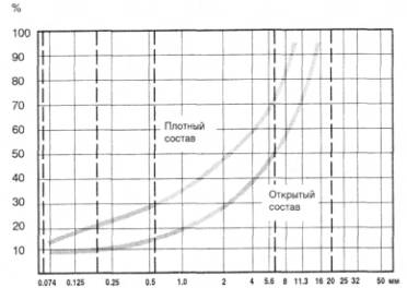 Гранулометрические кривые для материалов с плотным и открытым составом. СОДЕРЖАНИЕ БИТУМА