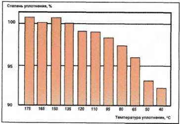 Прибор Маршалла предназначен для стандартного уплотнения асфальтобетонных образцов. Образцы используются для определения плотности, устойчивости (прочности) и деформативности (текучести). Результаты испытаний являются основой для выбора оптимального содержания битума. Испытания по Маршаллу определяют оптимум содержания битума для данного грансостава каменного материала. Образцы из горячей смеси с различным содержанием битума уплотняются с помощью копра в форме 10 см. Обычно делается 50 ударов с каждой стороны образца, но часто производится 75 ударов специально для автомагистралей и аэродромов. Испытания производятся на каждом образце для определения плотности, устойчивости (прочности) и деформативности (текучести). По результатам этих испытаний можно вычислить оптимум содержания битума в смеси. Плотность, достигаемая при оптимальном количестве битума, затем используется как эталонная плотность, когда устанавливается степень уплотнения при строительстве. Асфальтобетон должен содержать определенный минимум воздушных пор, чтобы иметь определенную устойчивость и деформативность и избежать выпотевания битума при высоких температурах. Плотный асфальтобетон нормально спроектирован, если содержание воздушных пор составляет от 3 до 6 % после уплотнения. СВОЙСТВА АСФАЛЬТОБЕТОННЫХ СМЕСЕЙАсфальтобетон и грунт имеют много общего, однако главное различие между ними заключается в когезионных свойствах битума, используемого для соединения частиц в асфальтобетонной смеси. Свойства и составы асфальтобетонных смесей изменяются в широких пределах. Их свойства и уплотняемость, главным образом, являются функцией от: • внутреннего трения • когезии • вязкостного сопротивления/температуры. Внутреннее трение определяется, главным образом, свойствами каменного материала и является более очевидным в хорошо подобранной смеси, чем в открытой. Смесь, содержащая природный окатанный материал, где частицы при уплотнении могут относительно легко двигаться относительно друг друга, имеет более низкое внутреннее трение, чем смесь с дробленым каменным материалом угловатой формы. Смесь с дробленым каменным материалом нуждается в более высоком уплотняющем воздействии, а также из нее получается асфальтобетонное покрытие с более высокой прочностью и устойчивостью, чем из аналогичной смеси, содержащей окатанный, природный каменный материал. Высокое содержание камня и большой максимальный размер камня тоже являются факторами, влияющими на устойчивость смесей. Вязкое сопротивление является функцией вязкости битума и фактической температуры смеси. Вязкое сопротивление препятствует перемещению частиц при уплотнении, и, чем меньше температура, тем выше это сопротивление. Зависимость между уплотняемостью и температурой показана на диаграмме ниже.