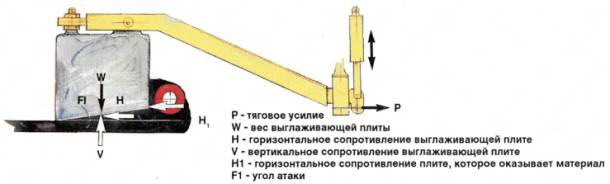 Равномерность потока материала через укладчик - из бункера (1), по конвейеру (2), через шнек (3) и к выглаживающей плите (4) - является необходимой для качественной укладки. ВЫГЛАЖИВАЮЩАЯ ПЛИТА Плита выравнивает и предварительно уплотняет асфальтобетонную смесь до определенной толщины, с определенным продольным и поперечным уклоном. Самовыравнивающаяся качающаяся плита крепится к тягачу на кронштейнах в двух точках, расположенных с обеих сторон от тягача рядом с его центральной точкой. Вертикальные перемещения выглаживающей плиты, вызываемые неровностями поверхности - минимальны. Это позволяет получать ровную поверхность, даже если нижележащее основание отчасти неровное. Так как каждый следующий слой покрытия расположен на предыдущем, неровности становятся все меньше и меньше. Точки крепления плиты расположены так, чтобы получить требуемую толщину слоя. Их положение может постепенно регулироваться электронной системой. Регулятор уклона автоматически поддерживает уровень поверхности относительно эталонной поверхности, например, с помощью лыжи или шнура, в то же время регулятор поперечного уклона используется для поддержания поперечного уклона выглаживающей плиты. Угол атаки Угол между низом выглаживающей плиты и поверхностью укладываемого слоя называют углом атаки. Он различный для разных плит и зависит от веса плиты, зоны контакта нижней части плиты и формы передней части плиты. Требуемая ровность поверхности получается, если все силы, воздействующие на плиту, находятся в равновесии (см. рисунок ниже и рисунок на стр. 32). Только после этого выглаживающая плита будет установлена с необходимым для нее углом атаки.