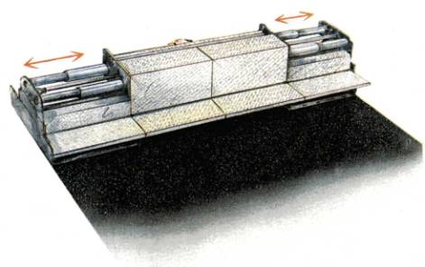 Выглаживающие плиты могут быть оборудованы трамбующим или вибрационным механизмом, или, как показано на рисунке, комбинацией из двух механизмов. Наклонное трамбующие движение, показанное выше, противостоит вертикальному и дает большее уплотняющее воздействие и уменьшает тенденцию дробления каменного материала. Трамбующие и вибрационные выглаживающие плиты Выглаживающие плиты с одновременно действующими системами, трамбующей и вибрационной, следует развивать для увеличения уплотняющего воздействия. Выглаживающие плиты с повышенной степенью уплотнения В настоящее время можно видеть новые типы выглаживающей плиты с повышенной степенью уплотнения, которые работают с использованием большого количества трамбующих и вибрационных элементов, действующих в комбинации. В некоторых случаях отпадает необходимость в укатке после выглаживающей плиты с повышенной степенью уплотнения, например, при укладке слоев, укрепленных цементом. Однако, как правило, все-таки требуется дополнительное уплотнение катками.