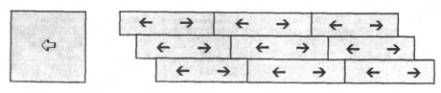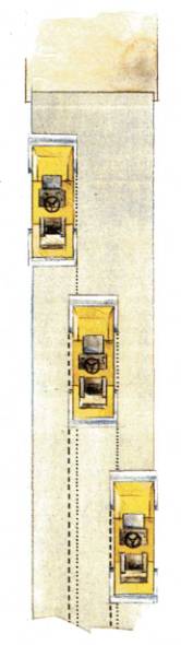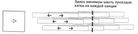Ниже показана схема укатки, наиболее приемлемая для постоянной и высокой скорости укладчика. Схема зависит от постоянной длины прохода катка и продольного перекрытия проходов постоянной длины. Практической трудности поддержания постоянной длины прохода можно избежать если катки оборудованы соответствующими измерительными инструментами (приборами) для определения длины прохода.
