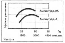 Обычное соотношение между уплотняющим эффектом, частотой и амплитудой. Влияние амплитуды существенно, в то же время частота имеет определенный Двойная амплитуда Часто представляется очень выгодным иметь возможность изменять вибрационное усилие катка. Наилучший способ достижения этого - изменить амплитуду. С двумя значениями амплитуды (двойная амплитуда) уплотняющее усилие может быть установлено в соответствии с различными типами материалов и толщинами слоев. Изменяемая амплитуда важна при уплотнении асфальтобетона. При работе на мягких смесях или тонких слоях наилучшие результаты достигаются при установке малой амплитуды. Это также снижает риск разрушения слабых агрегатных смесей. С другой стороны, более жесткие смеси и толстые слои требуют относительно больших амплитуд. При уплотнении зернистых слоев основания до высокой плотности лучше начинать с больших амплитуд. По мере увеличения плотности материала, валец зачастую начинает отскакивать. Это не увеличивает плотности даже при повышении количества проходов. Эффект отскакивания может быть предотвращен с помощью возврата к малым амплитудам, и тогда плотность будет увеличиваться. На насыпях необходима большая амплитуда.
