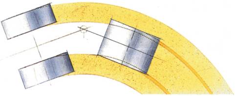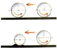 Двухподшипниковое устройство Разрезные вальцы Устройство вальца разрезным позволяет двум его половинам вращаться с разными скоростями. Это уменьшает сдвиги асфальтобетонной поверхности при работе на крутых поворотах. Если каток не имеет раздельных вальцов, оператор должен следовать общепринятым приемам работы на поворотах, чтобы обеспечить соответствующее выполнение качества (см. рисунок).