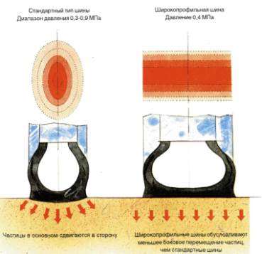 Основные части шины Они идеальны для затирания и конечной укатки асфальтобетона. Они также используются на укрепленных грунтах, но хуже подходят для обычного грунта, так как они не имеют такого глубинного эффекта, как стандартные шины. Форма контактной площадки и распределение давления для этих типов шин показано на рисунке. Так как давление в стандартных или низкопрофильных шинах может варьироваться, будет изменяться и форма контактной площадки.