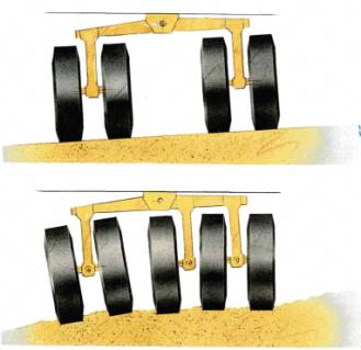 Перекрытие эпюр контактного давления. В отличие от единой "луковицы" давления имеется и общая результирующая "луковица", что обеспечивает улучшение глубинного эффекта. ВАЖНЫЕ ФАКТОРЫ Налипание асфальтобетонной смеси Во время начальной укатки на всех пневмошинных катках будет налипание асфальтобетонной смеси до тех пор, пока не будет использована солярка или специальная жидкость наподобие "Roller-eeze" (Ролириз). Солярка предотвращает налипание пока шины нагреваются. Она не вредит асфальтобетонной смеси, если используется умеренно; однако довольно часто авторитетные органы не разрешают применение солярки, так как в чрезмерных количествах она разжижает битумную составляющую асфальтобетона. Покрытие вследствие этого может быть повреждено достаточно быстро после открытия дороги для движения. Другие же жидкости, предотвращающие налипание, дороги и не всегда легко доступны. Распространенный метод, предотвращающий налипание, заключается в предварительном разогревании колес, путем проездов катка по уже уплотненной поверхности гладковальцовым катком, но все еще сохраняющей тепло. Как только разница в температурах между асфальтобетонной поверхностью и шинами не превысит 20°С, налипание будет незначительным или даже исчезнет вовсе. Вода из разбрызгивающей системы такжеэффективна для предотвращения налипания. Очистительные скребки также помогают уменьшить налипание в течение первоначального согревающего периода. Фартуки вокруг резиновых шин являются одним из способов сохранения тепла и предотвращения слишком быстрого охлаждения смеси. Они особенно полезны при работе в ветреных условиях. Качающиеся или поворачивающиеся колеса Пневмошинные катки должны иметь качающиеся или поворачивающиеся колеса, по крайней мере, на одной из осей. Качающиеся колеса дают лучшие результаты на уплотнении грунтов, а поворачивающиеся колеса более эффективны на асфальтобетоне. Обычно только передняя ось колеблется или поворачивается.
